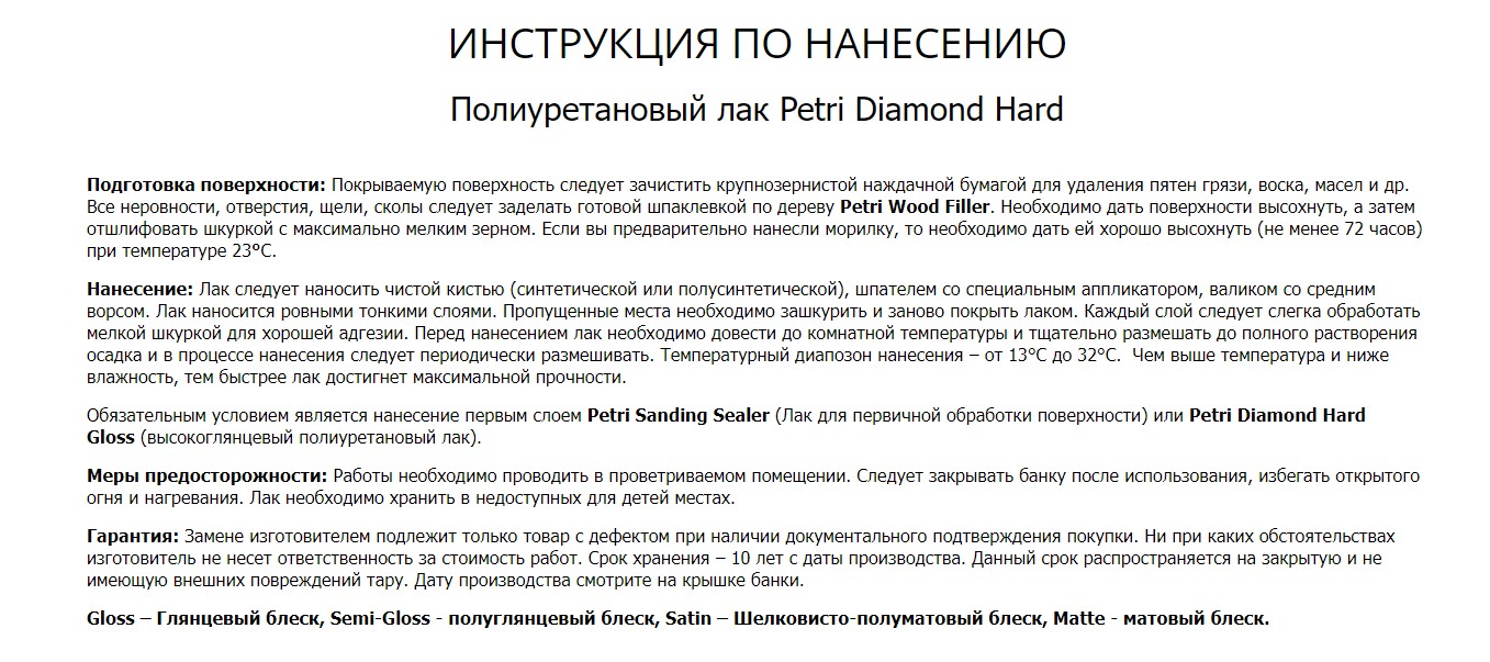 Полиуретановый лак Petri Diamond Hard глянцевый PC1711101 применяется для внутренних работ. Продукт наносится на деревянные поверхности и защищает их от царапин и износа. Рекомендован для использования в местах, которые подвергаются большим нагрузкам, вредному влиянию окружающей среды.