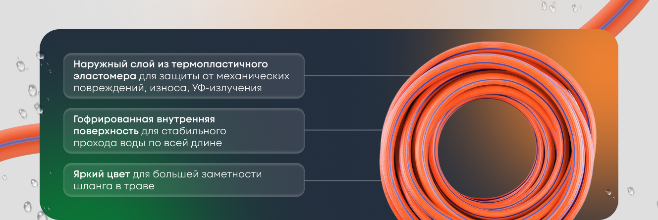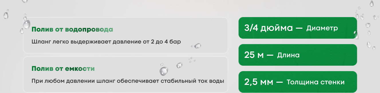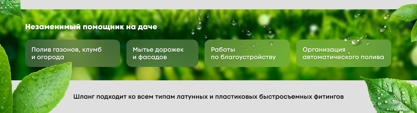 Шланг идеально подходит для : Садоводов и дачников, ценящих качество и удобство. Хозяйственных работ: мытья автомобилей, уборки территории и других задач. Использования в системах автоматического полива.