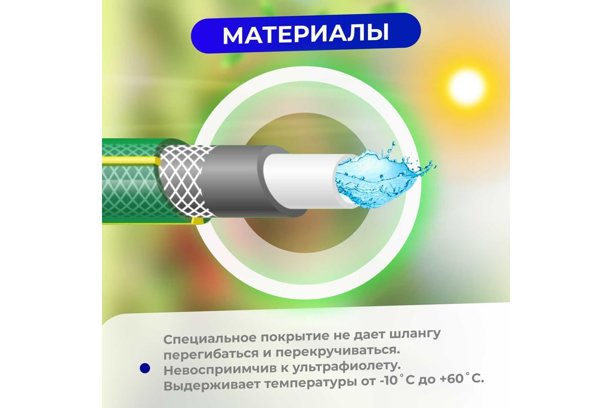 Надежность. Шланг из 4 слоев на основе эластичного суспензионного поливинилхлорида и других компонентов, армированный высокопрочной полиамидной нитью отличается повышенной герметичность и стойкостью к расслаиванию, высокой эластичностью, устойчивостью к низким температурам, длительным процессом старения, устойчивостью к ультрафиолетовому излучению, осаждению водорослей,