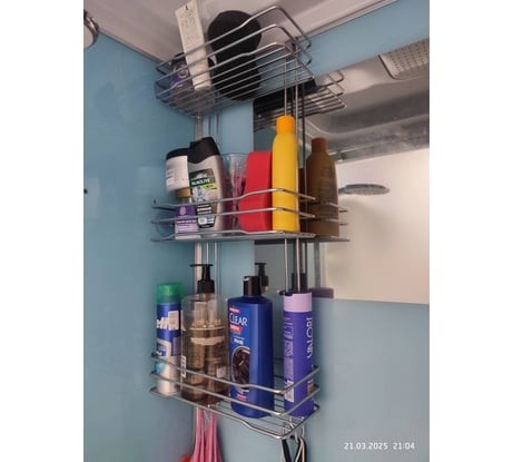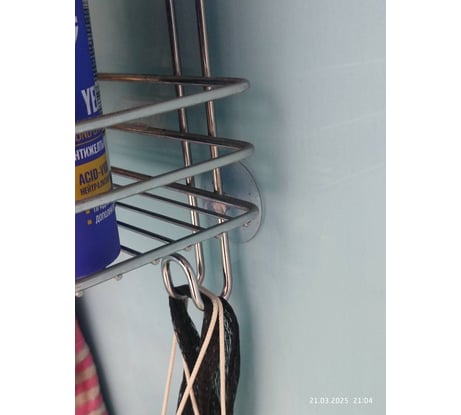 Полка массивная вместительная. Покупал для душевой кабины. Повесил крючками на заднюю стенку, и установил присоски по периметру, чтобы не стучал металл об стекло (при случайном касании).
