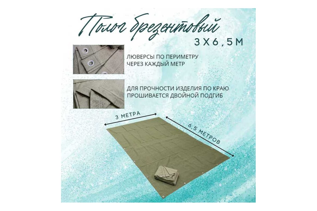 Полог брезентовый 3x6,5 м с влагоотталкивающей пропиткой ПК ЭЛИТТЕНТ 3X6T5VO380 изготовлен из плотного брезента пропитан специальной влагоотталкивающей пропиткой, для прочности изделия по краю прошивается двойной подгиб. Для удобства крепления изделия по периметру установлены оцинкованные люверсы диаметром 12 мм, шаг люверсов 1 м, все стыки прошиты антигнилостными нитями.