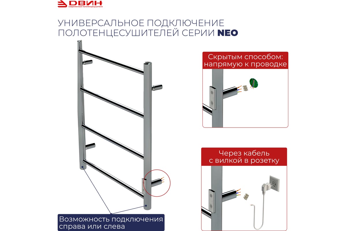 Электрический полотенцесушитель Двин – экономичный прибор с низким энергопотреблением. Продуманная конструкция делает возможным подключение к сети как с правой, так и с левой стороны.