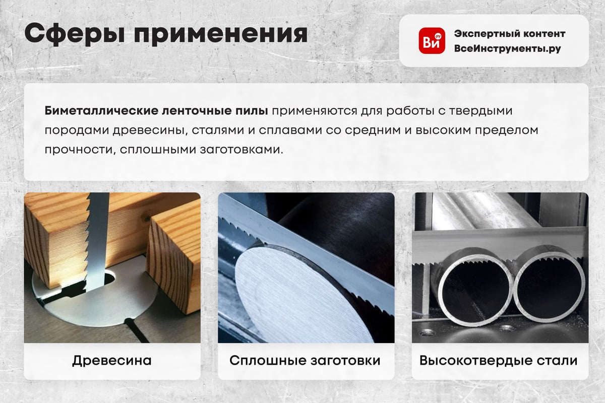 Полотно применяется при раскрое таких материалов, как сталь (нержавеющая, инструментальная, цементируемая, углеродная), цветных металлов, а также их сплавов.