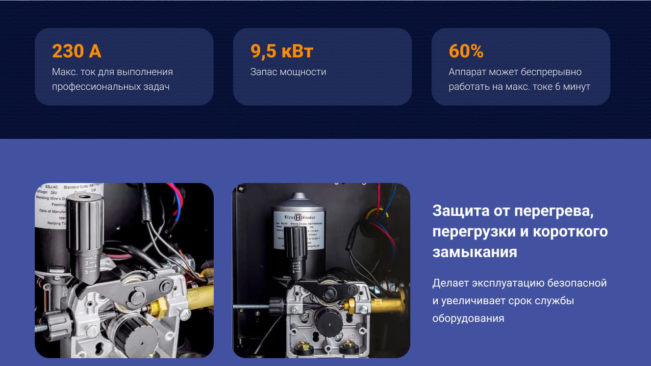 Класс изоляции F снижает вероятность пробоя даже при активном использовании. Для работы необходима среда защитных газов: СО2 или смесь газов.