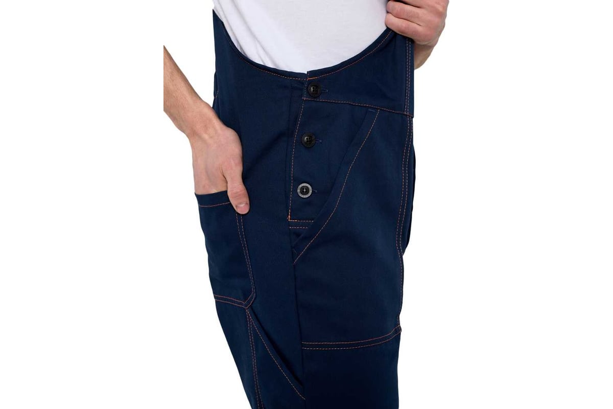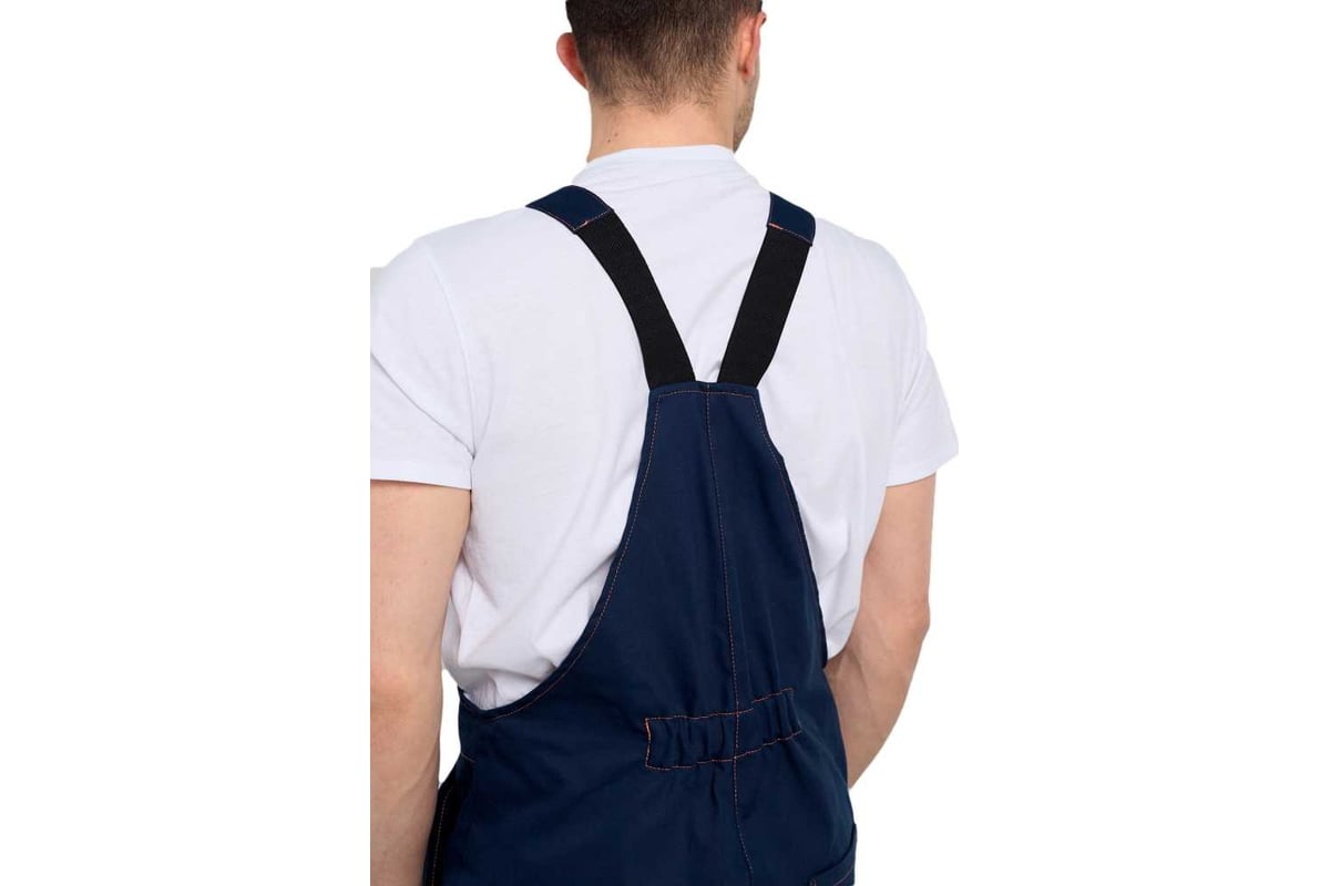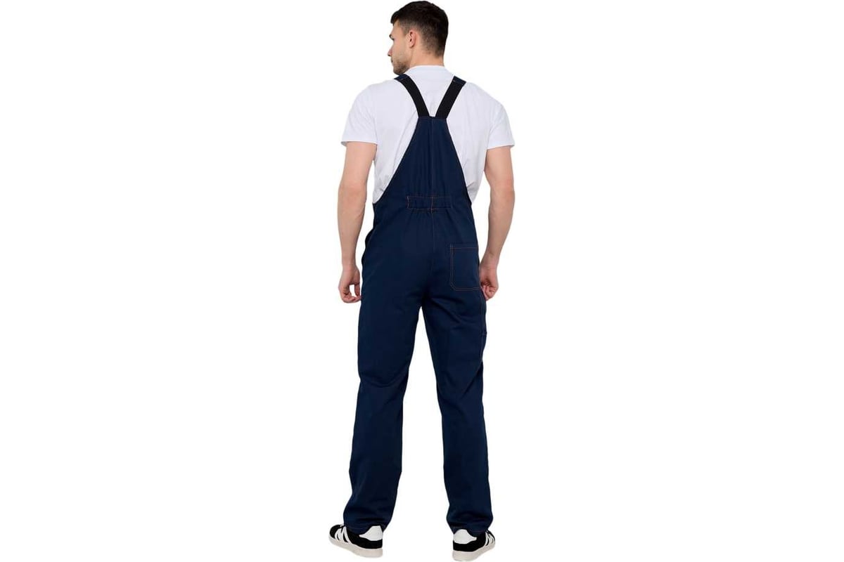 Задние половинки с одним накладным карманом и дополнительным карманом для инструментов. Бретели с эластичной тесьмой, регулирующиеся по длине. В области колен усилительные накладки.