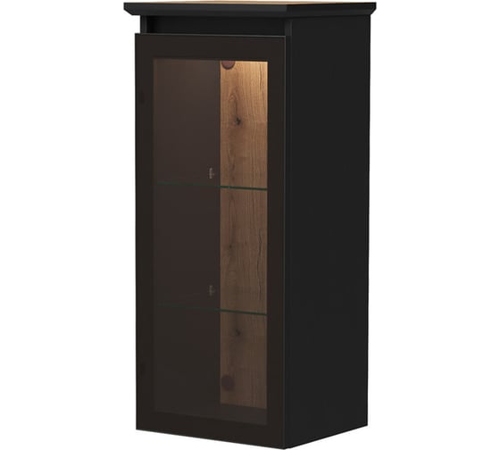 Полупенал с нейтральной внутренней LED-подсветкой. Управление подсветкой осуществляется при помощи сенсора, установленного на столешнице шкафа. Столешница изготовлена из МДФ в пленке ПВХ, поверхность столешницы облицована HPL пластиком. Также в столешница беспроводная зарядка для мобильных устройств. Корпус изготовлен из влагостойкого ЛДСП, фасад – из закаленного тонированного стекла в алюминиевом профиле с анодированным покрытием. За распашной дверцей для хранения предусмотрены две стеклянные полки. Петли на дверце оснащены доводчиками. Конструкция пенала предусматривает возможность открывания как налево, так и направо.