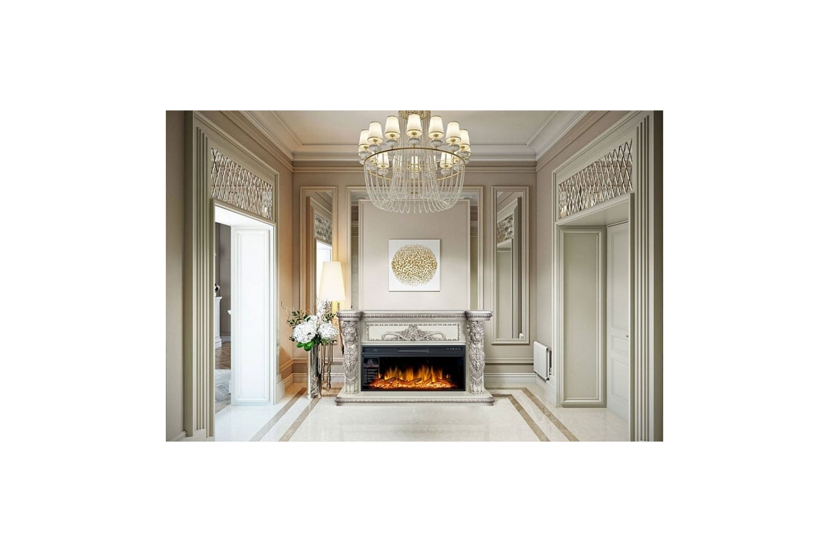 Эффектный дизайн портала позволяет интегрировать его практически в любой классический интерьер. К порталу подходят электрические очаги Royal Flame с реалистичным пламенем и функцией обогрева, которую можно включать лишь по мере необходимости, благодаря чему камин, в отличие от дровяных аналогов, подходит для круглогодичного использования.