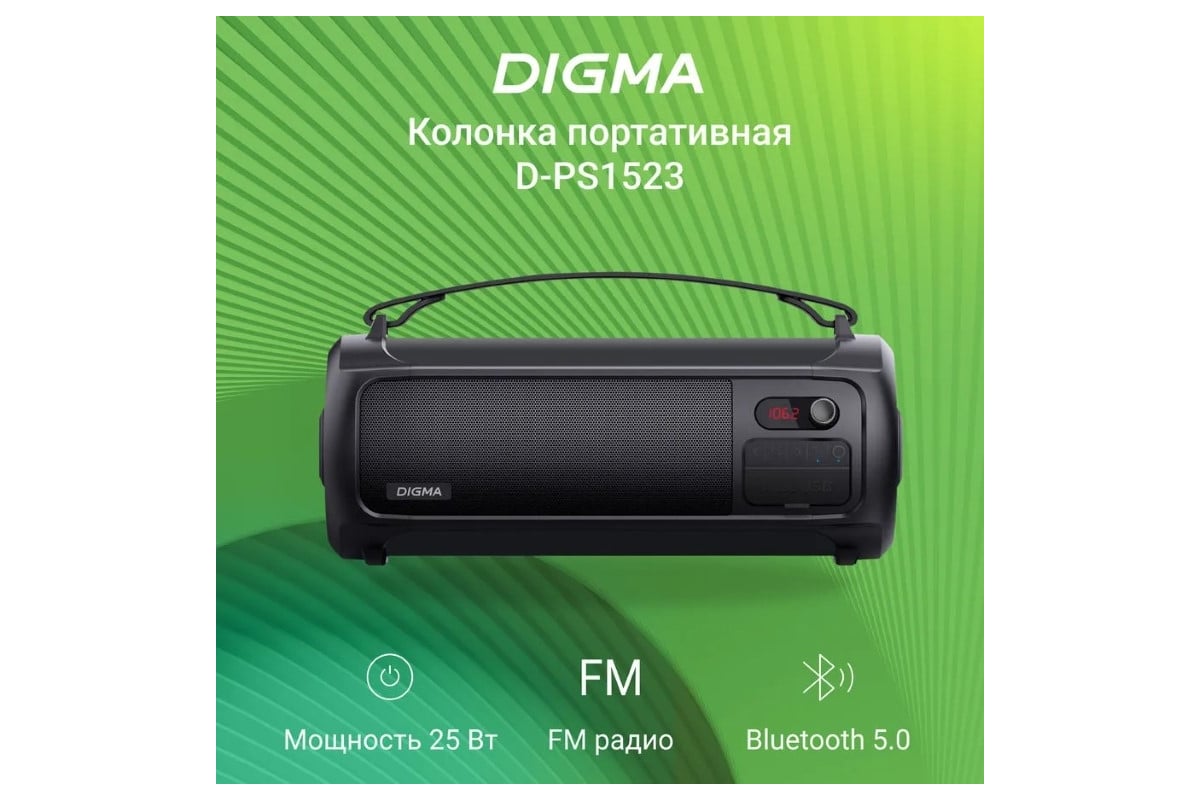 Портативная колонка DIGMA D-PS1523 черный 25W 2.0 BT 10 м 1800 mAh SP1523B 1864798 предназначена для прослушивания музыки.