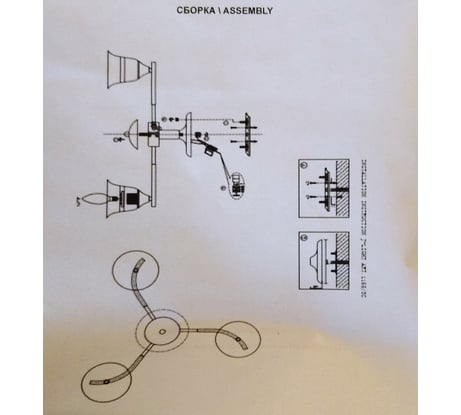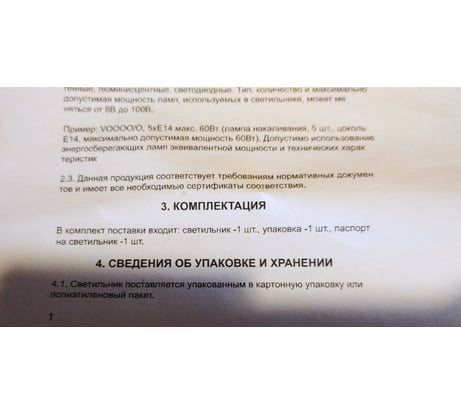 К деталям и узлам, которые обнаружил в комплекте претензий нет. Претензии к самой комплектации и, собственно, к тому, как позиционируется сей товар. В паспорте и на упаковке написано, что это люстра. На самом деле набор "собери сам, если сможешь". В комплекте ОТСУТСТВУЮТ детали, на которых, собственно, собирается данная конструкция. Это металлическая трубка диаметром 10мм с мелкой наружной резьбой, гайки крепления М10х1 и некая художественная гайка, накручивающаяся на ту же трубку снизу. Так же нет центрального провода, соединяющего проводки ламп с подводящим кабелем.