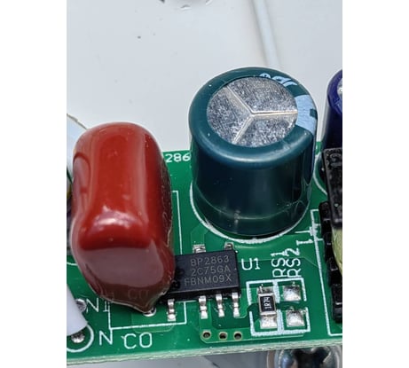 1 линия из 18 светодиодов 2835. Место есть для другого формата. Драйвер на контроллере bp2863 с встроенным мостом. Оба конденсатора на 400V (5,6 и 2,2 мкФ). На заземление положили аж 4 шайбы. Ток пока не мерил.