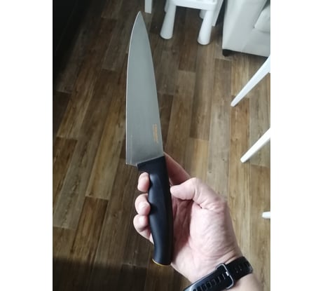 В нашей семье этот нож уже несколько лет. И он стал просто не заменимым помощником не только на кухне, где он режет всё, от больших кусков мяса, до тонкой нарезки фруктов и овощей, но и в частых поездках на дачу, пикники, рыбалку. Его огромным достоинством является чехол, которого я не встречал ни у одного поварского ножа. Благодаря этому чехлу, нож можно положить в любую сумку, или даже рюкзак, не боясь порезать их. Также всегда с нами доводчик ножей и топоров от Fiskars. Пара движений, и все продукты нарезаются с лёгкостью.