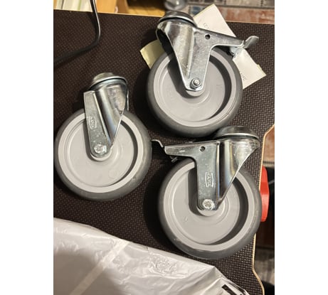 Все характеристикиПоворотные колесные опоры, крепление - отверстие под один центральный болт. Полипропиленовый обод колеса с шинкой из темно серой резины, твердость 85±3° Shore A, не оставляет следов на полу. Пластиковая педаль тормоза у диаметра 50 мм и стальная у диаметров 75 и 100 мм.