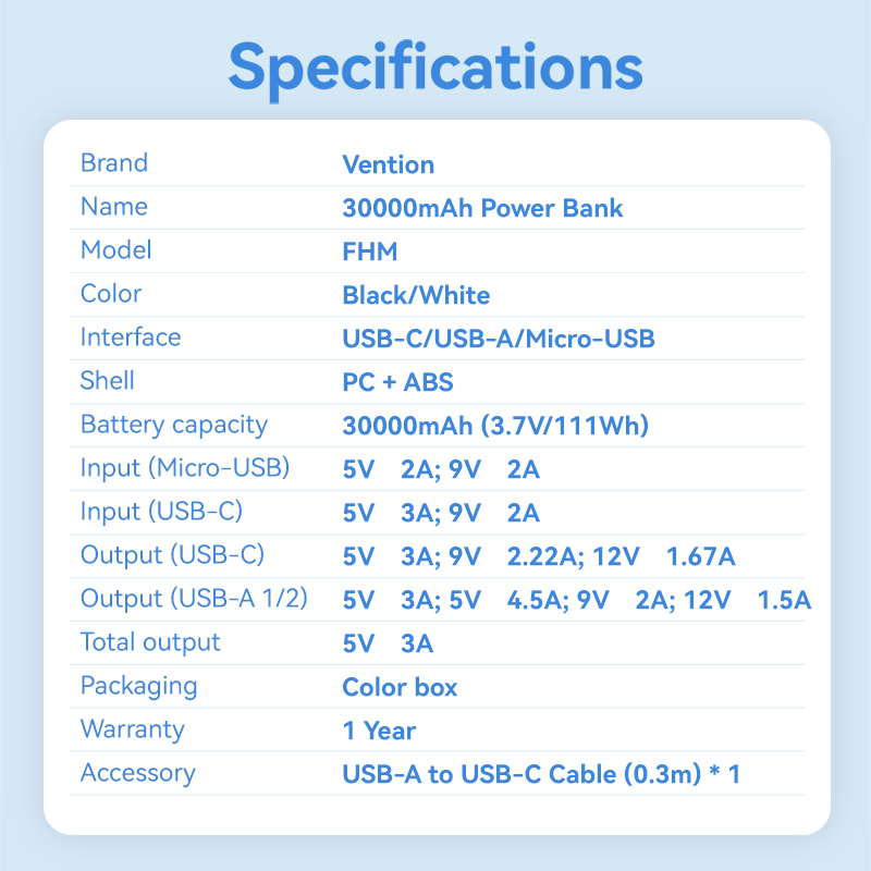 Power Bank VENTION 30000mAh(Micro-USB/C-A/A)22.5W, черный с LED-дисплеем FHMB0