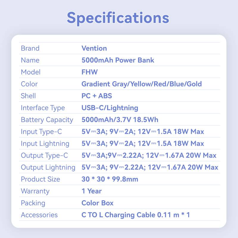 Power Bank VENTION 5000mAh(USB-C + Lightning) 20W серо-белый FHWM0