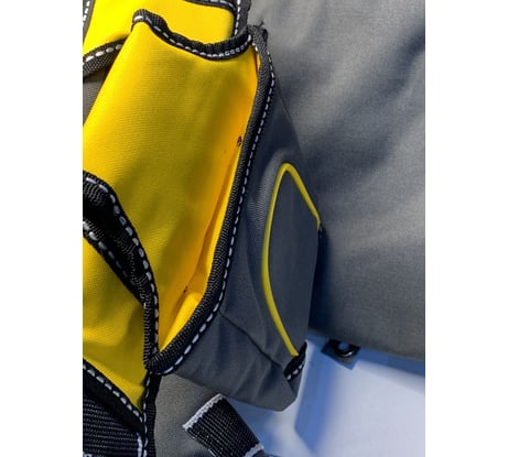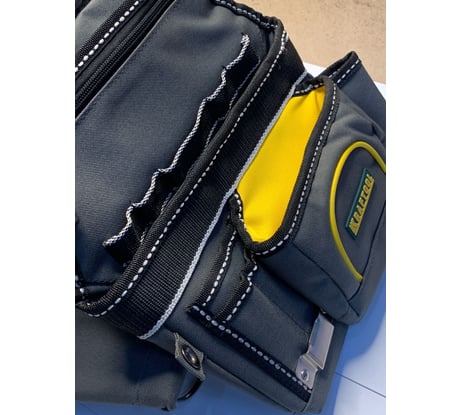 Отличный пояс, да немного громоздкий, но привыкнуть можно, я привык буквально за 2 небольших монтажа. В карманах жёлтого цвета видны все саморезы, прошит качественно, помещается всё что нужно. И сам пояс удобный.