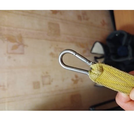 Используя этот мини-карабин и 2 полипропиленовые веревочки, мы смастерили приспособление, защищающее мелкие ручные инструменты от падения вниз при работе на высоте. Для этого он и покупался. Одна веревка завязывается на запястье, другая – в отверстие в ручке инструмента, обе веревки скрепляются карабином. И вуаля! Просто, но надежно. Можно спокойно работать, не боясь, что инструмент случайно выпадет вниз. Да, существует специальный страховочный браслет с креплением, но он дорогущий и не всегда есть в продаже. Конечно, наша приспособа тяжелые инструменты вроде дрели или «шурика» вряд ли удержит, но ножницы, кисточку, отвертку, ножик и т.д. – ВПОЛНЕ.