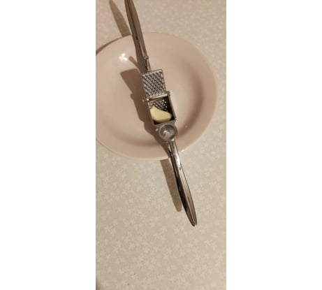 Сталь категории 18/10, несомненно плюс, вес тоже не подкачал, не тяжелая, но и не легкая, конструкция надежная, сразу испытала, давит легко и непринуждённо, пленка чесночная смывается на раз, без всяких щеточек и приспособлений, просто губкой с моющим средством, за такой ценник, просто находка, единственное это, то, что капля чеснока раздавленного всё - же проходит сзади, на фото видно, но так, как это первая моя чеснодавилка я не знаю, может у всех так. Вторая часть конструкции с зубьями входит хорошо, не впритирку, но и не болтается. Для меня все хорошо