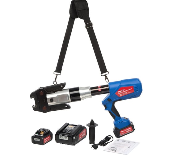 Инструмент оснащен поворотным патроном с вращением 310°, что позволяет выбрать удобное и безопасное положение инструмента в углах и труднодоступных местах. Рукоятка пресс-адаптера съемная для облегчения его раскрытия. Предусмотрена кнопка обратного хода (сброса) поршня для использования при нештатных, аварийных ситуациях. В комплект входят два Li-Ion аккумулятора емкостью 5.0 А∙ч и зарядное устройство. Кейс для безопасной транспортировки и хранения также входит в комплект поставки. OLED дисплей информирует о проценте заряда батареи, времени прессования, неисправностях и рекомендациях по техническому обслуживанию. Усилие обжима 65 кН.