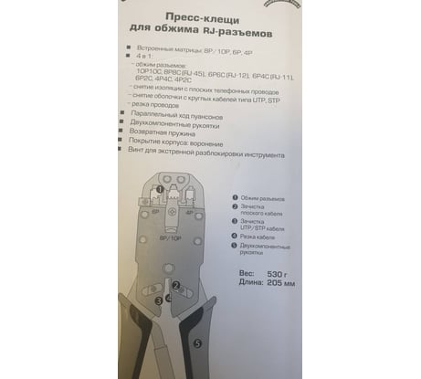 1. Сендвич из листов, а не рама из одного штампованного листа. Тяжелые, надежные. Техническая эстетика на высоте. 2. Эргономика рукояток. Мягкое сжатие без заеданий. 3. Ровная линия зубцов. 4. Разъем RJ45 обжимает отлично - правильный четкий обжим разъема без ломания перегородок и язычков. 5. Бюджетно для проф инструмента и в то же время уже уровень выше хлипких китайцев.