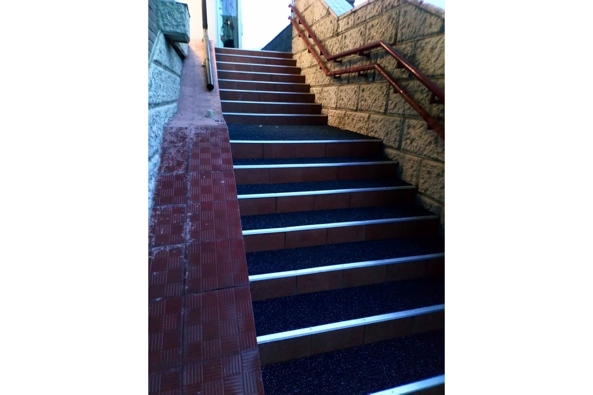 При желании легко режется обычными бытовыми ножницами, это позволяет создавать ступени любой ширины и длины. На уличные ступени рекомендуется крепить покрытие, обычно это делается на саморезы или жидкие гвозди, если же покрытие лежит цельным куском на ровной поверхности - то крепление не обязательно, благодаря своему весу и антискользящей основе, он будет неподвижен.