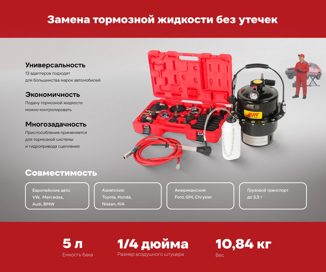Приспособление для прокачки тормозов JTC 4331 - это оборудование профессионального уровня, которое позволяет не только ускорить, но и улучшить процесс замены тормозной жидкости. Применение данной модели исключает утечки, а также различные традиционные ошибки, возникающие в ходе работ. Большой комплект поставки позволяет использовать приспособление для большинства существующих марок автомобилей.