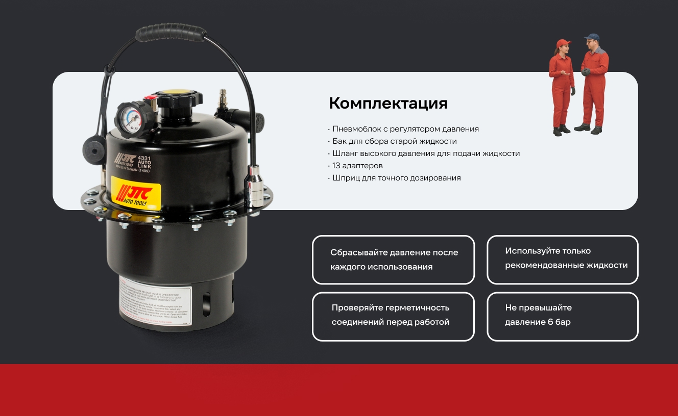 - Адаптеры, входящие в комплект приспособления для прокачки тормозов JTC 4331, поставляются в эргономичном кейсе, оснащенном индивидуальными ложементами под каждое из изделий, специальными замками-защелками, а также удобной транспортировочной рукояткой;