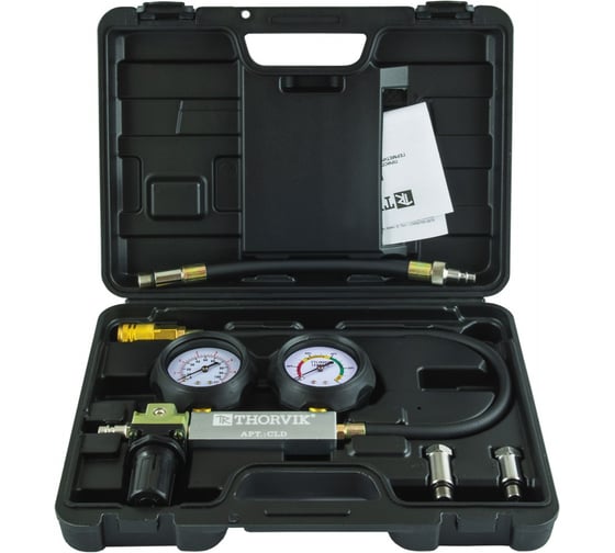 Приспособление для проверки герметичности цинидров ДВС Thorvik приспособление с двумя манометрами, при помощи которого можно выявить целый ряд неисправностей, как плотность примыкания клапанов, целостность прокладки головки блока цилиндров, выявить трещины в стенках цилиндров, проверить плотность прилегания поршневых колец в двигателе внутреннего сгорания.