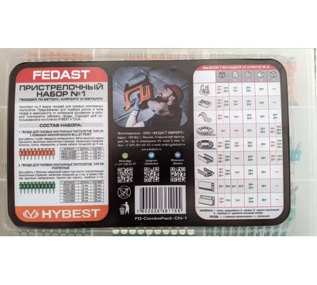 Пристрелочный набор гвоздей по бетону, кирпичу и металлу Fedast №1 FD-ComboPack-CN-1 - комплект из 9 видов гвоздей по бетону, кирпичу и металлу необходим для подбора длины и типа гвоздя в зависимости от материала основания, в который планируете забивать гвоздь. Гвозди подходят для использования с газовыми монтажными пистолетами по бетону HYBEST.