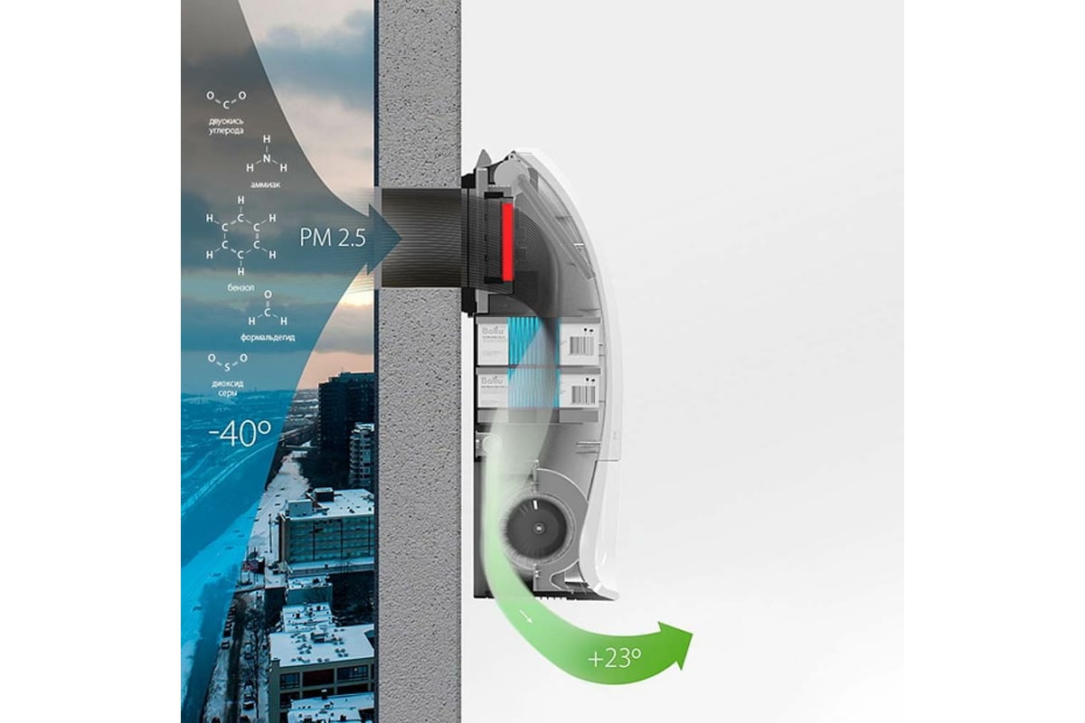 Встроенный высокоэффективный керамический нагревательный элемент мощностью 1200 Вт подогревает входящий воздух. При этом прибор эффективно работает в осенне-зимний период при температуре наружного воздуха до -40°С. Профессиональная система очистки воздуха, состоящая из 6 ступеней, устраняет 99,9% загрязнений в воздухе, поглощает неприятные запахи, обеззараживает от вирусов и бактерий. В приборе есть арома-капсула для масел, позволяющая создать индивидуальную атмосферу на любой вкус. Встроенный датчик РМ2,5 в зависимости от качества воздуха, автоматически управляет интенсивностью очистки в режиме циркуляции. Датчик CO2 контролирует уровень углекислого газа в помещении и автоматически управляет клапаном притока, поддерживая оптимальный уровень CO2. Прибор имеет удобный интерфейс, который обеспечивают цветной дисплей и полифонический звуковой сигнал, встроенный Wi-Fi модуль для удаленного управления прибора с мобильных устройств, пульт ДУ в комплекте.