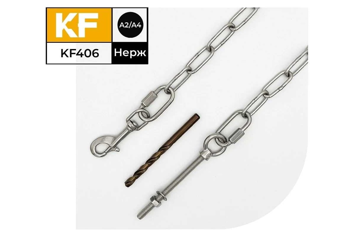 Система KF406 предназначена для крепления цепи собаки в металлическое сквозное отверстие или в отверстие с резьбой М8, а также в сквозное деревянное отверстие с глубиной до 90 мм. Рекомендованная производителем максимальная нагрузка составляет до 128 кг, предельная нагрузка на разрыв составляет 509 кг.