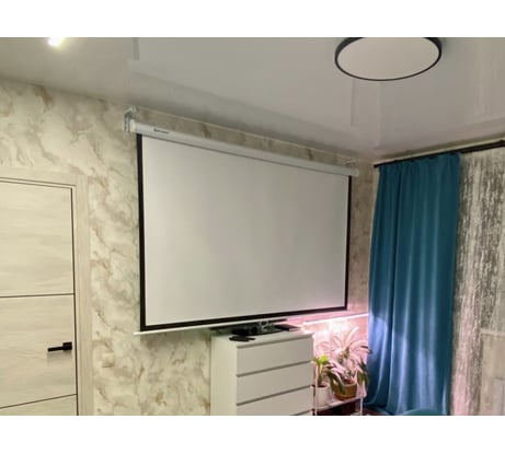 Хороший экран, картинка чёткая, в сложенном состоянии корпус экрана белый на потолке, выглядит не массивно. Нет крепежа, пришлось придумывать на, что крепить, а так в целом экран понравился.