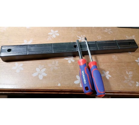 Отличный держатель. В отзывах на стандартные магнитные крепления некоторые пользователи указывали, что из-за намагничивания жал отвёрток с круглым сечением их не получается располагать близко друг к другу - как видите, с данной планкой таких проблем нет вообще. Есть нюанс, на который стоит обратить внимание при монтаже - в зависимости от ориентации планки инструмент будет либо намагничиваться, либо РАЗмагничиваться, поэтому предварительно проверьте намагниченность жал, и обозначьте верх-низ.