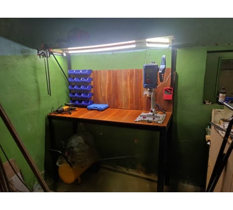 В общем и целом станочек свое дело делает. Сверлил уголок 4 мм, сверло 9 мм, сделал больше 90 отверстий. Никакого сравнения с дрелью. Точности большой при этом не требовалось. Надо понимать, что это не станок с ЧПУ и не ставить перед ним непосильных задач. Люфты гуляют, но в разумных пределах. Прижимной механизм необычный, но зажимает деталь хорошо. Думал приобретать к нему обычные тисочки, но сейчас понимаю, что они мне не нужны. Лазер на моем аппарате попадает точно. Кнопка вкл/выкл на своем месте и использовать тоже удобно. Подсветка не помешала бы. Регулировка скорости вращения шпинделя тоже хорошая штука и пользоваться легко и понятно, притом что сбоку есть таблица, какую скорость нужно выбирать в зависимости от диаметра сверла и материала. Сам станок работает тихо. К верстаку не крепил, без этого стоит устойчиво. По сборке: вроде материалы все хорошие (на мой взгляд), но ощущение что собирали его в каком-то гараже. На стойке случайно обнаружил что маркером (маркером!!!) отмечено где сверлить отверстие для болта (на фото видно). Т.е. точность сборки на производстве тоже ого-го. Шкалу глубины сверления, вообще наверно по пьяни лепили (на фото). Пока такая функция не требовалась, как появится необходимость тогда и буду как-то решать вопрос. Но если отбросить мелкие придирки - станок отличный. Для гаража, дачной мастерской самое то.