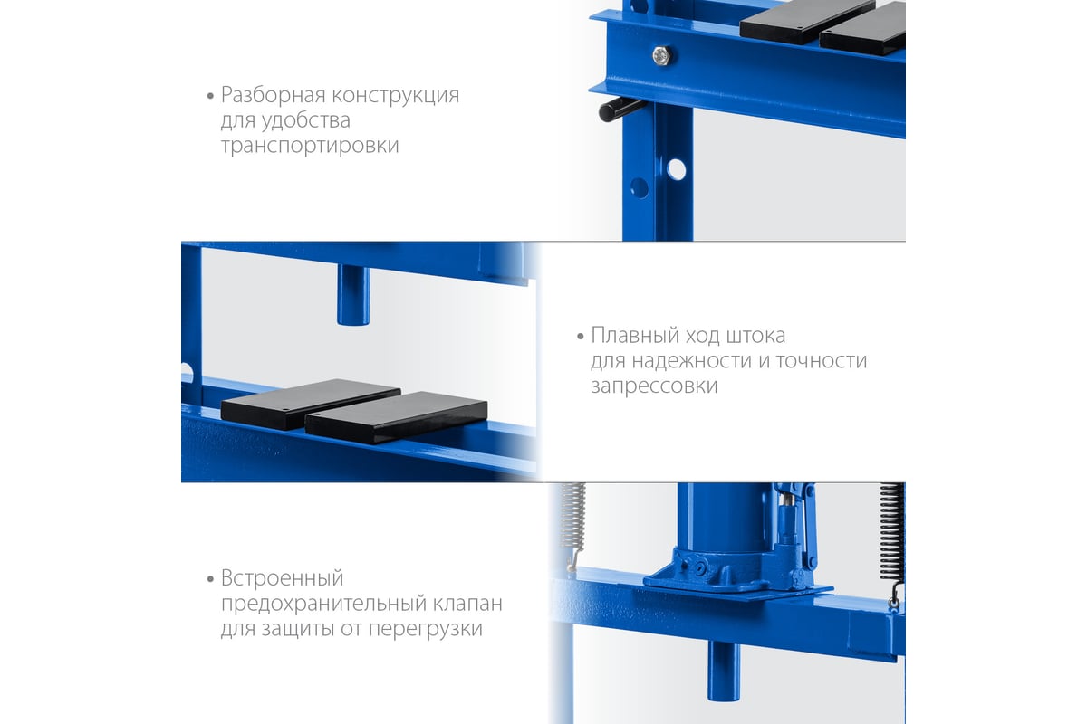 Гидравлический пресс ЗУБР предназначен для сжатия и изгиба материалов, запрессовки и выпрессовки подшипников и других слесарных работ. Пресс имеет возможность регулирования высоты рабочего пространства посредством перемещения станины. Силовым устройством данных прессов является домкрат, что обеспечивает низкую стоимость и высокую ремонтопригодность изделия. Домкрат оснащен клапаном, предохраняющим от перегрузок.