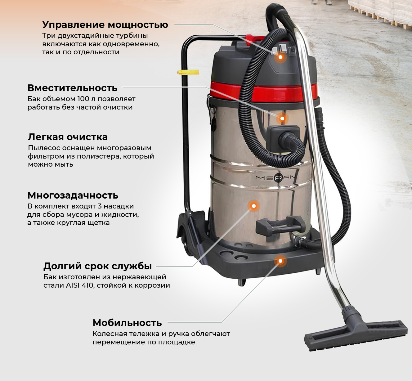 Профессиональный пылеводосос MERAN 3000 Вт 100lVC-3/100T R 100339073 оснащен тремя двухстадийными турбинами с независимым охлаждением и управлением. Служит для сбора жидкой грязи, сухого и влажного мусора. Удобство работы обеспечено возможностью опрокидывания бака. Необходимая оснастка всегда находится под рукой благодаря пластиковому держателю, установленному на раме. Аппарат установлен на прочной тележке с удобной ручкой и колесами, что позволяет легко перемещать его в необходимое место. Многоразовый фильтр промывается водой. Данная модель разработана для профессионального применения и позволяет вести продолжительные работы.