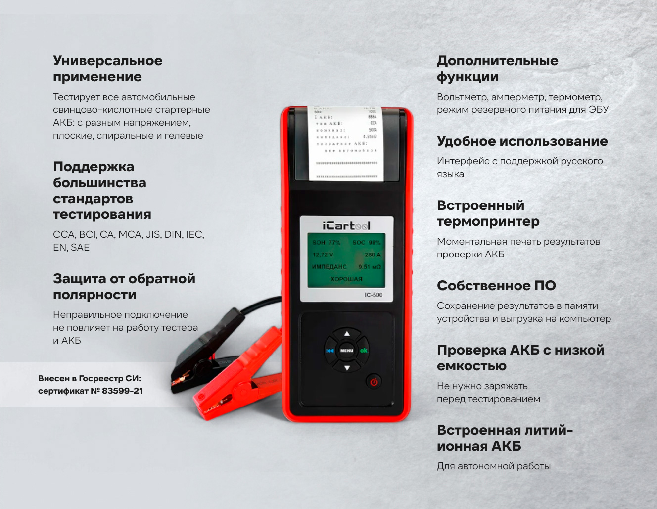 Профессиональный тестер аккумуляторных батарей 12/24V iCartool IC-700 предназначен для проверки АКБ по самой современной технологии тестирования проводимости, быстро и точно измеряет ток пуска холодного двигателя, оценивает степень заряженности АКБ и определяет основные неисправности в системе пуска двигателя и зарядки, что позволяет точно и аккуратно выявлять неисправности и ускоряет процесс ремонта. Оснащен встроенным принтером. Применяется при техническом обслуживании автомобилей и в ремонтных мастерских.