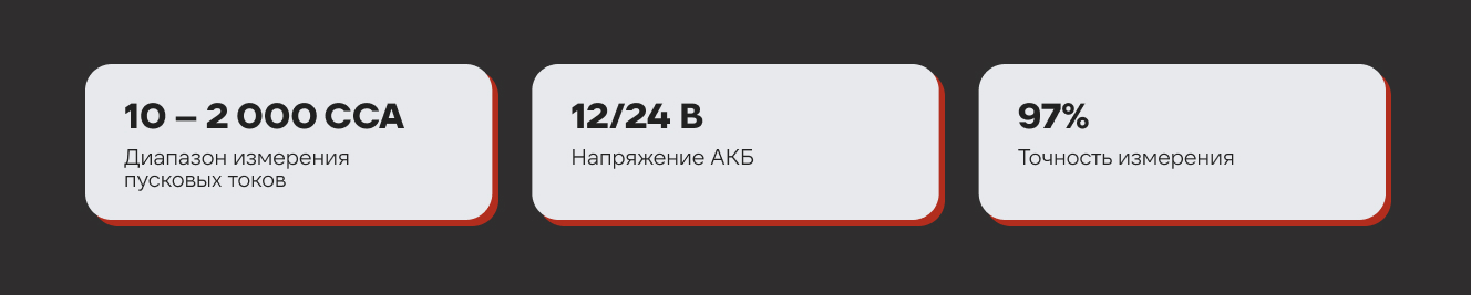 - Тестирует все автомобильные свинцово-кислотные стартерные АКБ, в том числе стандартные АКБ, плоские АКБ AGM, спиральные АКБ AGM и гелевые АКБ.