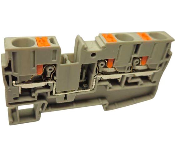 Проходная клемма на Din-рейку, 3 точки подключения в клемме, тип фиксации провода: push-in, номинальное сечение: 6 мм кв., 41A, 1000V, цвет: серый, клеммы на дин-рейку, пружина