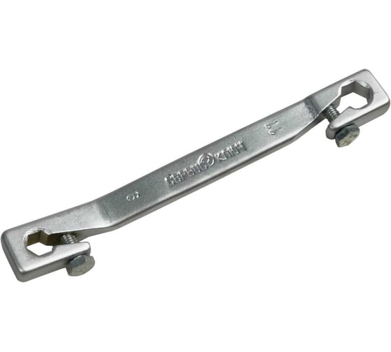 Инструмент состоит из длинного металлического стержня с двумя разными размерами зажимных головок - 9 и 11 мм, что делает его универсальным решением для различных моделей автомобилей. Головки имеют открытую форму, предназначенную для ослабления или затяжки гаек или болтов в труднодоступных местах. Также приспособление дает возможность проведения работ с сорванными гранями.