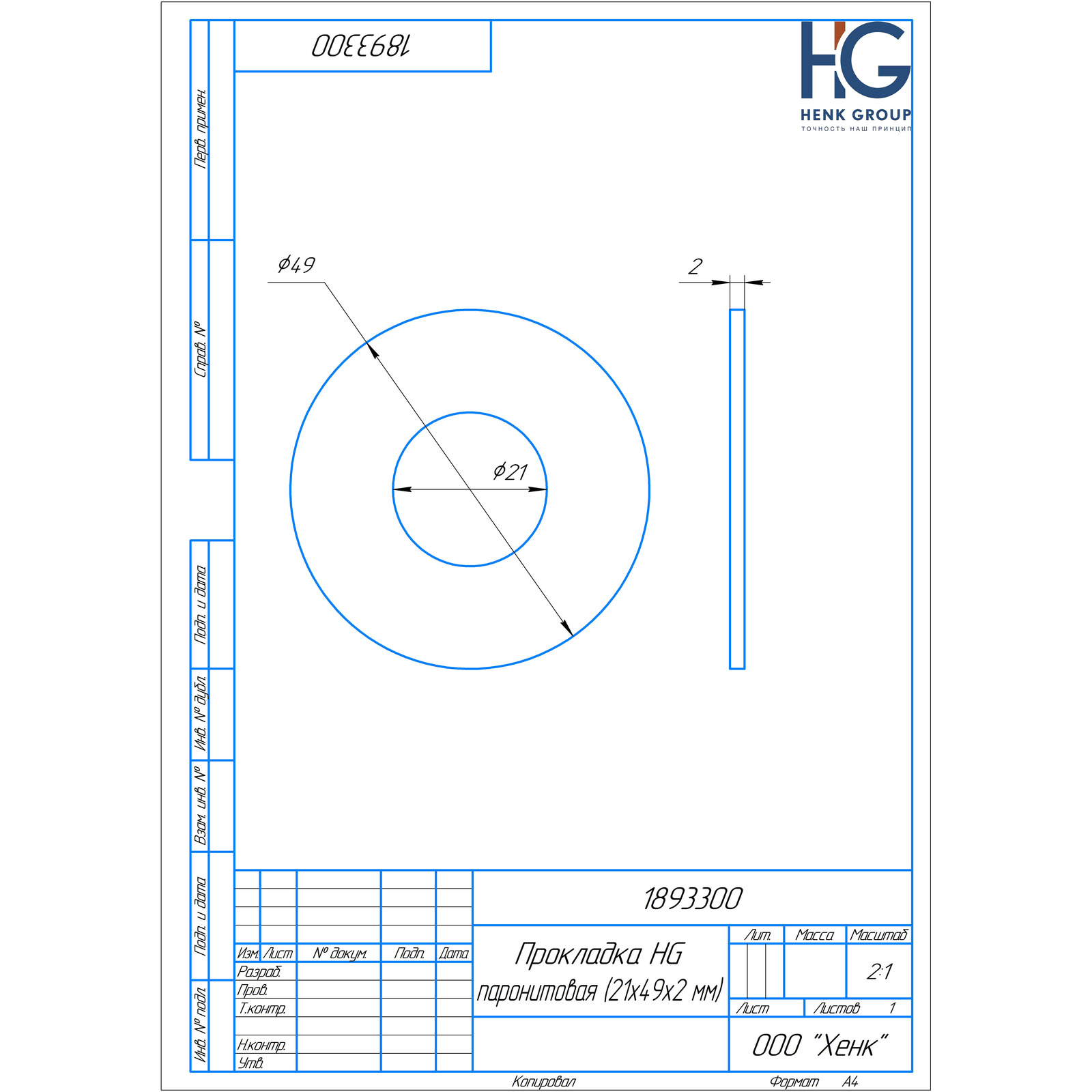Прокладка HG паронитовая 21x49,5x2 мм, 2 шт 1893300