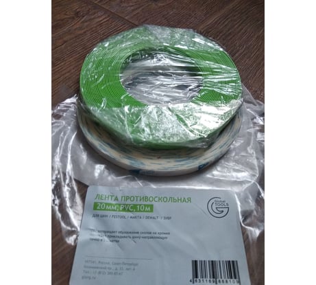 Когда забирал, к сожалению, проверил только этикетку. Толщина упаковки на ощупь - около 20 мм, соответствует. Когда вскрыл, оказалось, что в упаковке лежит лента скольжения и скотч, которые и дают в сумме 20 мм, что и ввело в заблуждение. Лента вот эта наверное: https://www.vseinstrumenti.ru/product/lenta-skolzheniya-globaltools-10-mm-re-zelenaya-skotch-orl-50-m-p-dlya-shiny-festool-makita-dewalt-hilti-elitech-zubr-gt-008-115-0009-9401984/ Правда там 50 п.м. обещают. Не ведитесь, обман.