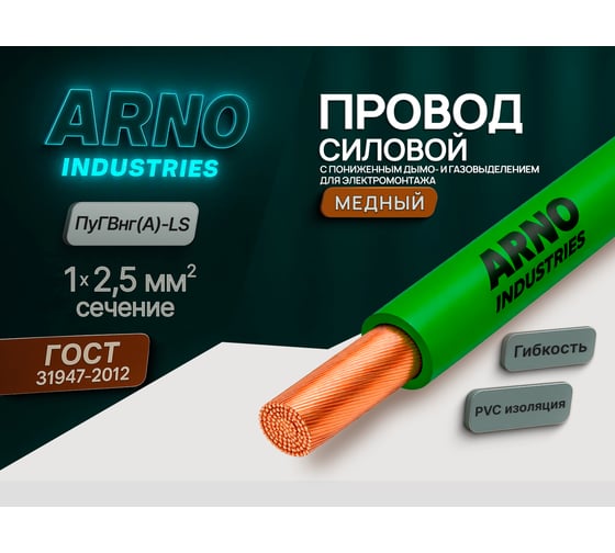 Провод силовой ARNO INDUSTRIES медный, 10м, ПуГВнг(А)-LS 1х2.5 зеленый, гибкий, LS низкое дымо-газовыделение, для электромонтажа ТРТС 23856151