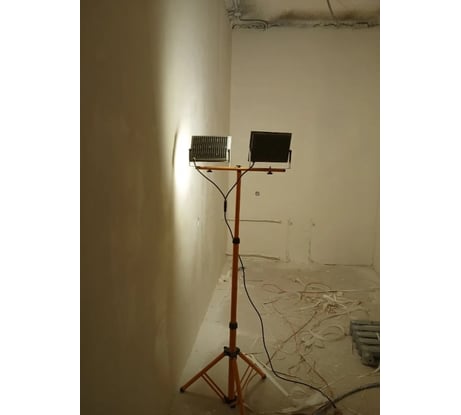 Прожектор дает равномерный яркий свет без бликов и мерцания. Штатив легкий, но прочный, легко переносится между объектами. Длина штатива позволяет поднять источник света на достаточную высоту. Работает стабильно даже при низких температурах