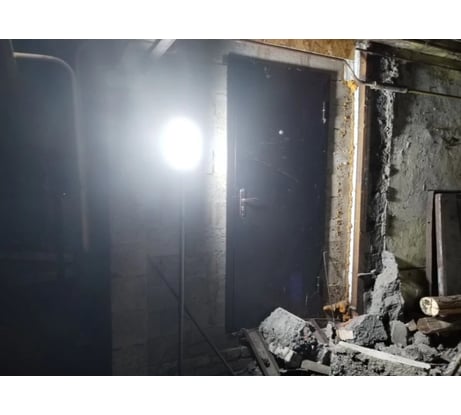 Очень мощный, светит как дневной — идеально для строительной площадки. Корпус крепкий, удобный кронштейн для регулировки