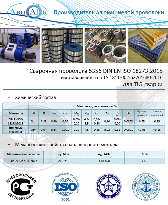 Универсальный сплав. Можно использовать для сварки 4, 5, 6 и 7 групп сплавов. Высокое содержание магния позволяет получить удовлетворительную прочность сварного соединения, а хром – мелкое зерно в шве. Наиболее хорошо зарекомендовал себя для сварки цинк-содержащих сплавов и 6 серии