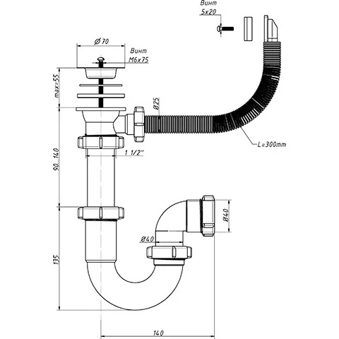 Прямоточный сифон ORIO 1 1/2 40, с переливом S-4104