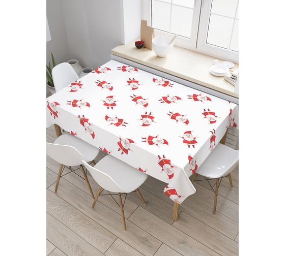 Прямоугольная скатерть JoyArty Дождь дед морозов из сатена tc_6836_120x145 надежно защищает поверхность стола от грязи, легко стирается и практически не мнется. Материал, из которого сшита скатерть, имеет рельефную текстуру, обладает высокой износостойкостью, подходит для кухни и выдерживает большое число стирок. Скатерть относится к категории фототекстиля, она поможет оформить кухню. Изображение наносится методом сублимационной печати, благодаря чему рисунок обладает яркостью и четкостью, что позволяет подобрать этот аксессуар в любом стиле и цветовой гамме. Скатерти представлены в двух типоразмерах.