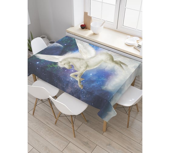 Прямоугольная скатерть JoyArty Лунный пегас из сатена tc_29740_120x145 защищает поверхность стола от грязи, легко стирается и практически не мнется. Материал, из которого сшита скатерть, имеет рельефную текстуру, обладает высокой износостойкостью, подходит для кухни и выдерживает большое число стирок. Скатерть относится к категории фототекстиля, она поможет оформить кухню. Изображение наносится методом сублимационной печати, благодаря чему рисунок обладает яркостью и четкостью, что позволяет подобрать этот аксессуар в любом стиле и цветовой гамме. Скатерти представлены в двух типоразмерах.
