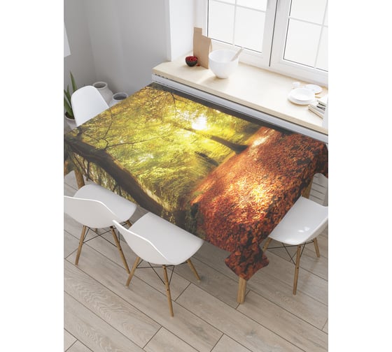 Прямоугольная скатерть JoyArty Осеннее утро в лесу из сатена tc_37663_120x145
