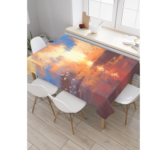 Прямоугольная скатерть JoyArty Птичий перелет на закате из сатена tc_23079_120x145 надежно защищает поверхность стола от грязи, легко стирается и практически не мнется. Материал, из которого сшита скатерть, имеет рельефную текстуру, обладает высокой износостойкостью, подходит для кухни и выдерживает большое число стирок. Скатерть относится к категории фототекстиля, она поможет оформить кухню. Изображение наносится методом сублимационной печати, благодаря чему рисунок обладает яркостью и четкостью, что позволяет подобрать этот аксессуар в любом стиле и цветовой гамме. Скатерти представлены в двух типоразмерах.